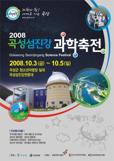 곡성군(군수 조형래)은 오는 10월 3일부터 5일까지 섬진강변 곡성군 청소년야영장과 곡성섬진강천문대 일원에서「2008 곡성 섬진강과학축전」을 개최한다.