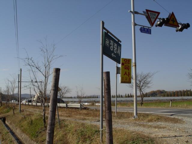 사찰을 안내하는 이정표와 나란히 서있는 두 개의 기둥은 민선 3기 생태도시에 걸맞게 처음 시도된 나무 안내판이지만 관리가 제대로 되지 않아 이제는 도심미관을 저해하는 물건으로 전락했다.