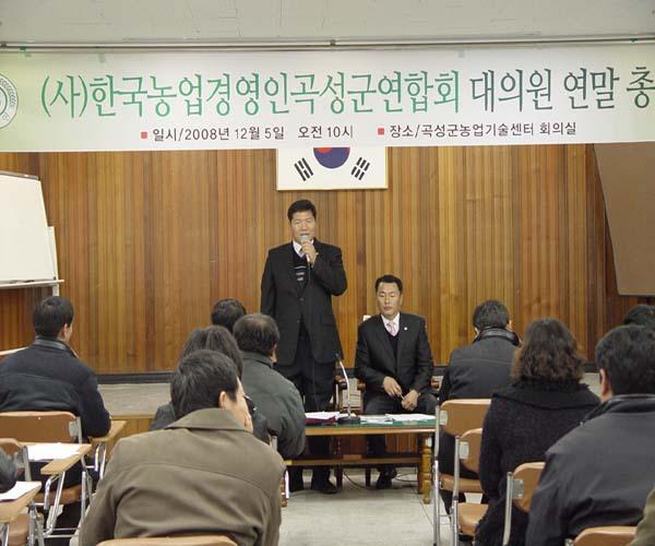 한국농업경영인곡성군연합회(회장 유장수)는 최근 농업기술센터 회의실에서 대의원 60명이 참석한 가운데 연말총회를 개최하고 ‘2008년도 사업결산과 2009년도 신규임원’을 선출했다.
