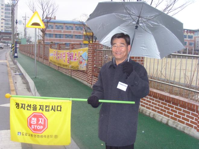 민 씨는 비가 오나 눈이 오나 매일 아침 초등학교 앞에서 교통안전 지킴이 봉사활동을 하고 있다.(사진)