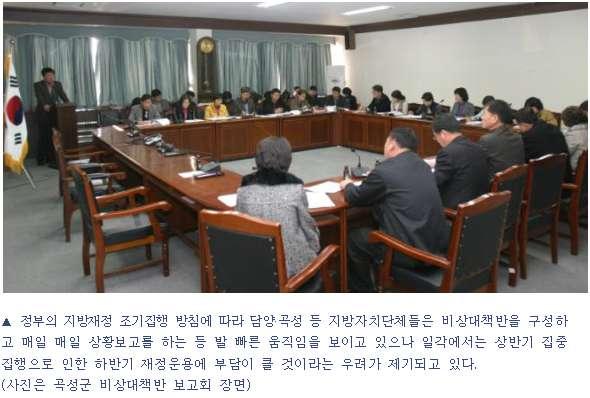 담양군과 곡성군에 따르면 행안부는 전국 지자체 회계과장 회의를 갖고 일선 지자체에 지방재정 조기집행 비상대책 추진계획을 전달했다.