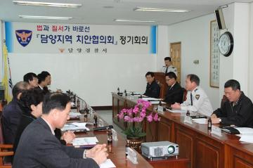담양지역치안협의회(공동위원장 안병갑 서장, 주영찬 군수권한대행)는 31일 경찰서 소회의실에서 양대수 군의회 의장, 신봉수 소방서장 등 참여기관단체장 12명과 경찰서 경무과장(국윤상) 등 5명이 참석한 가운데 2009년 제1차 담양지역치안협의회 정기회의를 가졌다.(사진)