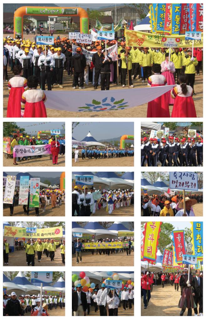 또 천년고찰 태안사와 와룡체육공원 및 때 묻지 않은 순후한 인심과 더불어 무농약, 유기농 친환경농업 1번지로서 보성강에서 자생하는 은어, 참게 매운탕, 다슬기탕으로 유명한 죽목면민들이 얼굴을 선보였으며 전국에서 유일하게 사탕옥수수를 재배하여 곡성 이미지를 제고하는 한편 딸기 멜론 옥수수 고추 상추 등 특화작목 육성으로 곡성군에서 가장 높은 농가소득을 올리고 있는 고달면 선수단이 행사장에 모습을 드러냈다.