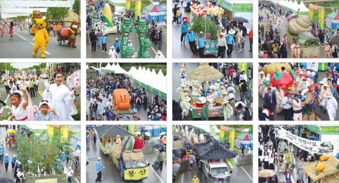 그리고 월산면(면장 김봉규)은 특산물인 딸기, 방울토마토, 멜론, 국화를 형상화한 꽃차 퍼레이드와 한우 사육 전초기지를 상징하는 전통 소달구지 행렬 및 새로운 소득원으로 급부상하고 있는 송이버섯을 상징하는 마스코트와 어르신들의 건강 활력소인 실버댄스팀 및 축제의 감초로 등장하는 각설이와 마음이 넉넉한 아버지 어머니의 정겨운 모습을 표현해 많은 박수갈채를 받았다.