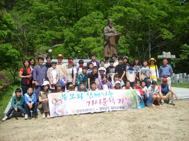 9일 담양관내 중학생과 학부모, 교사 등 40여명이 참여한 가운데 실시된 가사문학기행은 가사문학의 효시로 불리우는 상춘곡의 저자 불우헌 정극인 선생이 머물며 작품 활동을 했던 정읍 칠보면 시산리 원촌마을을 시작으로 담양의 한국가사문학관과 소쇄원, 송강정, 면앙정을 찾아 태산풍류에서 계산풍류로 이어지는 가사문학의 흐름을 더듬어 보는 시간을 가졌다.