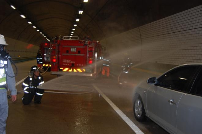 이날 훈련은 소방서, 도로공사 등 7개 기관 50명, 장비17대가 동원됐으며 장성방면 터널0.5km지점에서 승합차가 타이어 파손으로 터널벽에 충돌하여 화재가 발생하고 뒤따르던 승용차가 연쇄적 추돌한 것으로 가상하여 진행됐다.