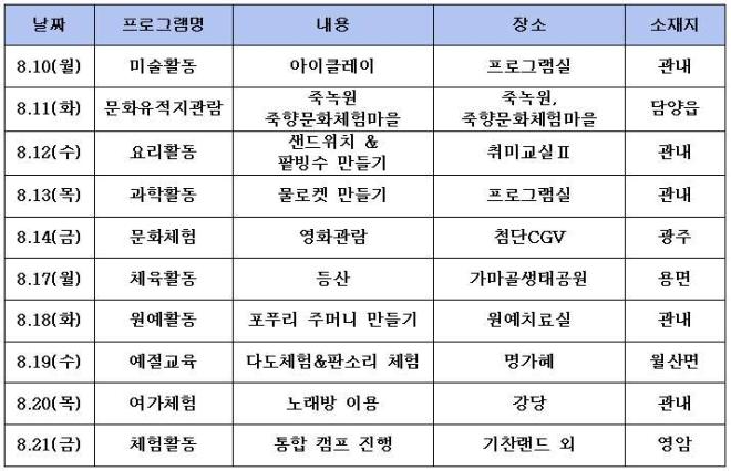 모집기간과 인원은 이달 7월 31일까지 선착순으로 10명을 모집하며 담양관내 장애청소년이면 지원이 가능하다. 참가비는 4만원(수급권자는 2만원)으로 오전 컴퓨터 교육은 무료이다. 오전, 오후 프로그램 개별 신청이 가능하고 해당 지역 차량운행과 간식이 제공되며 문의 및 접수처는 혜림종합복지관 382-4548번으로 하면된다. /김형준 인턴기자