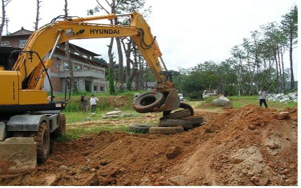 농원공사 현장책임자인 유 씨에 의하면 1년 전 족구장 등 체육시설로 활용하기 위해 운동장을 조성하면서 주변에 축대용으로 사용했던 타이어 일부를 매립 했다는 것이다.