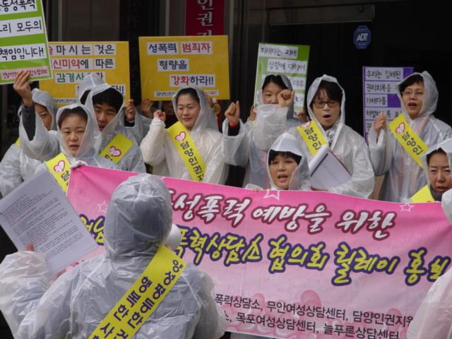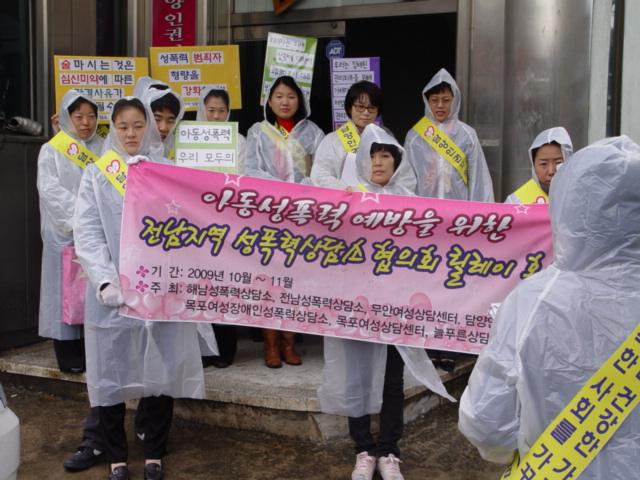 그리고 담양인권지원상담소를 비롯한 목포여성상담센터, 해남성폭력상담소, 전남성폭력상담소(순천), 무안여성상담센터, 목포여성장애인성폭력상담소, 늘푸른상담센터(나주) 회원들로 구성된 전남지역성폭력상담소협의회는 이같은내용을 관철시키기 위해 겨울비에도 아랑곳하지 않고 만성교-중앙지구대-담양터미널-담양문화회관-중앙공원에서 상가와 주민들을 대상으로 가두캠페인을 전개했다.