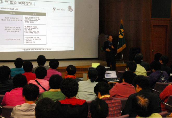 이날 교육을 위해 박상도 대덕대학교 행정학교수를 초청, CO2를 줄이는 생활의 지혜 등 녹색성장을 위한 친환경 생활화 운동 실천 방법 등 저탄소 녹색성장에 대한 올바른 이해를 돕는 교육의 장이 됐다.