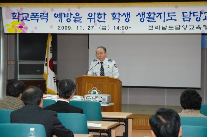 안병갑 담양경찰서장은 지난 27일 교육청 대회의실에서 열린 관내 초·중·고등학교 생활지도 담당교사 연찬회에 참석 ‘청소년 비행사례분석 및 학교폭력 예방 대책’이란 주제로 특강을 실시했다.(사진)