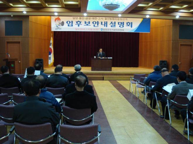 담양군선거관리위원회는 지난 11일 문화회관 소공연장에서 담양 봉산 금성 대전 고서 월산농협장 선거 입후보예정자들을 대상으로 안내설명회를 개최했다.(사진)