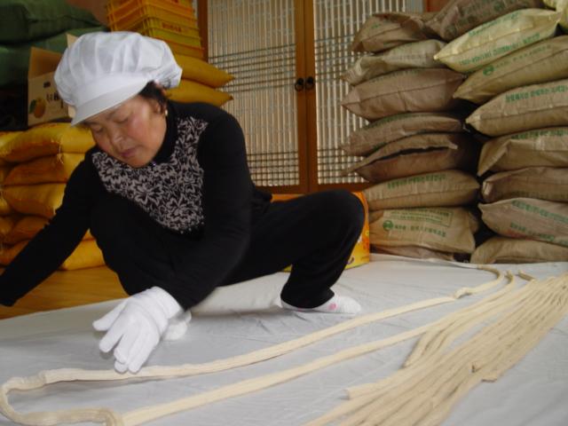 그리고 청량감을 주기 위해 곱게 갈은 생강을 첨가하여 적당히 졸인 조청을 뜨거운 아랫목에서 두 사람이 맞잡고 공기를 적당히 넣어가며 늘이기를 수차례, 하얀 빛깔로 변하게 된다.