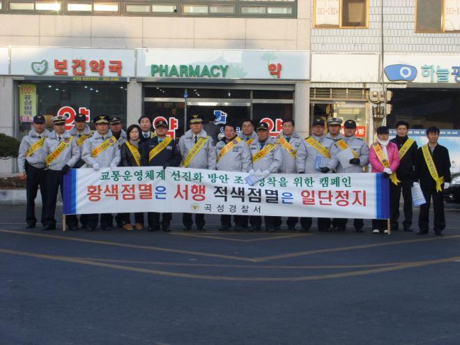 곡성경찰서(서장 이화선)는 19일 군청사거리에서 올해 추진 중인 ‘교통운영체계 선진화 방안 5대중점과제(직진우선 신호운영, 지정차로제 확립, 비보호좌회전 확대, 회전교차로 확대보급, 교차로 꼬리물기 근절) 조기정착을 위한 사회적 관심 및 공감대 확산을 도모하고자 지자체 및 협력단체(모범운전자회, 녹색어머니회) 합동 교통캠페인을 실시했다.(사진)