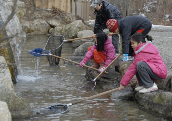 겨울방학을 맞아 부모와 함께 온 초등학생들이 뜰망을 들고 이리저리 헤엄쳐 다니는 메기를 쫒아 다니느라 여념이 없다.