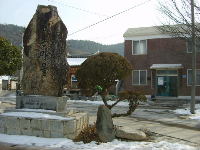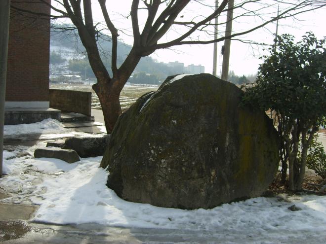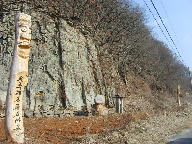 ▲ 마을 앞 석벽. 효자비와 장승, 범죄 없는 마을비가 서 있다.