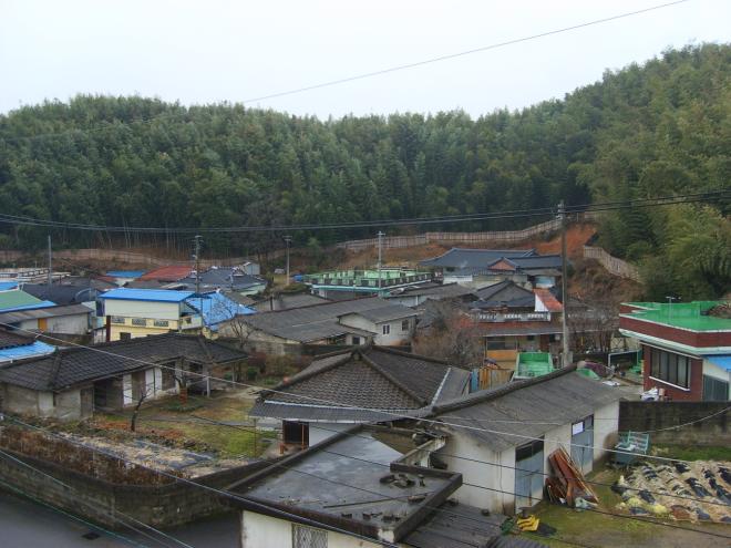 ▲ 마을과 죽녹원을 경계 짓는 죽책이 보인다. 지금은 큰 건물들이 마을을 둘러싸 옥상이 아니고서야 마을 전경을 볼 수 없다.