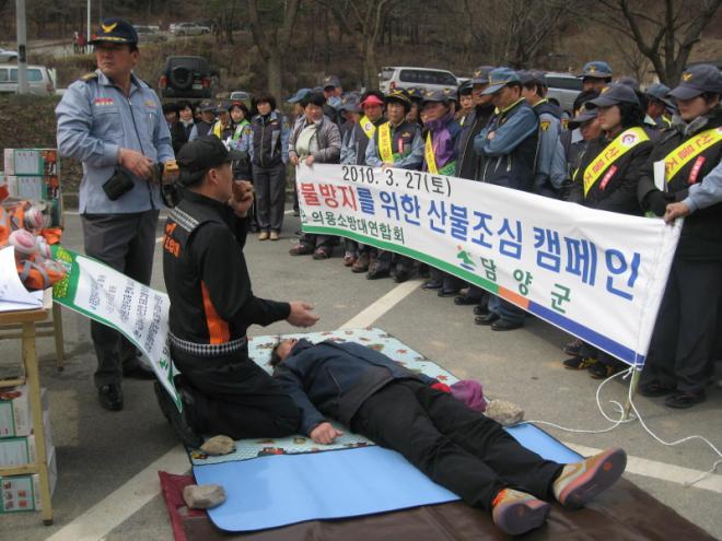 이날 캠페인은 추월산, 병풍산 금성산, 소쇄원 입구 등 주요등산로 4개소에서 동시에 실시하였으며, 소방관 25명 의용소방대원 512명이 참여한 가운데 어깨띠를 두르고 주말 산을 찾는 등산객과 지역민에게 산불예방의식 고취를 위해 전단지 배부, 리본 달아주기 등 산불예방 캠페인을 실시했다.