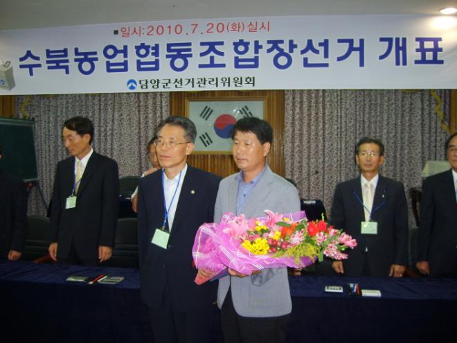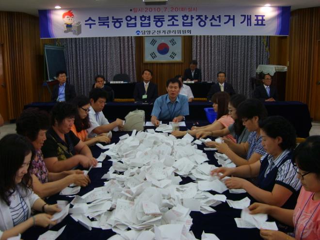 지난 20일 수북농협을 이끌어갈 조합장을 뽑는 선거에 1731명의 조합원 중 1502명이 투표에 참여해 86.8%의 투표율을 보였는데 기호 3번 김식 후보가 815표(54.2%)를 얻어 608표(40.4%)를 얻는데 그친 기호 2번 문규선 조합장의 3선을 저지하는데 성공했으며 기호 1번 채범기 후보는 69표를 얻는데 그쳤다. 무효는 10표 기권은 229표이다.(사진)