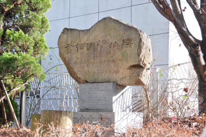 ▲한국농어촌공사 담양지사 앞마당에 자리한 백동제 터 기념비. 비석에는 ‘향백동제지비(香栢洞堤址碑)’라 쓰여 있다.