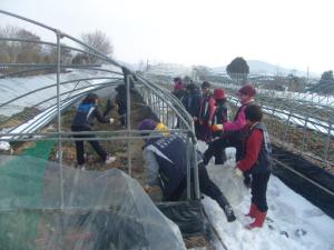 수북면 여성의용소방대원 20여명은 지난 19일 수북면 궁산리 일대를 뒤덮은 폭설로 피해를 입은 비닐하우스 딸기 모종 철거작업 등 봉사활동을 전개했다.