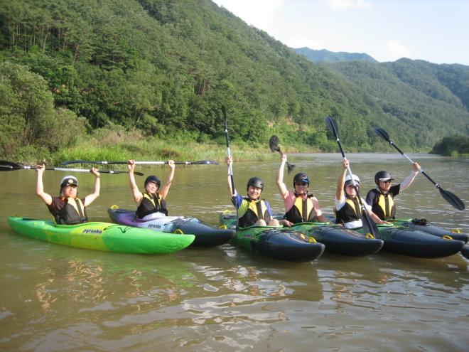 방명록에 서명하고 일행은 서둘러 죽곡면 카누 체험장으로 이동하였습니다. 모두들 처음 타본 것으로 물에 빠질 수 있다는 두려움 속에서도 간단한 조교의 설명을 듣고 카누에 몸을 실었습니다. 노를 들고 한 번, 두 번 저을수록 미끄러지는 것이 마치 얼음위를 스케이트 타고 미끄러지는 것과 같았습니다. 카누에 몸을 싣고 물위에서 바라보는 보성강은 또 다른 별천지였습니다. 잔잔한 물결위에 유유히 떠 있는 카누에서 구름 한 점 없는 맑은 하늘, 진한녹색으로 꽉 찬 주변 숲, 물밑에 노닐고 있는 치어들을 보노라니 세상 근심걱정 다 잊는 편안한 마음이었습니다.