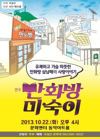 ‘만화방 미숙이’는 대한민국연극대상 창작뮤지컬상은 받은 뮤지컬 만화방 미숙이를 관객들에게 한 발짝 더 다가가기 위해 극단 해오름에서 연극으로 제작하였으며, 이번에는 곡성 군민들에게 선보이게 된다.