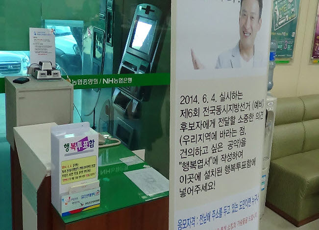 ‘행복투표함’은 담양군청 민원봉사과와 농협중앙회 담양군지부 2곳에 설치되어 있으며, 우리지역에 바라는 점이나 건의하고 싶은 공약을 행복투표함 옆에 비치된 행복엽서에 적어 행복투표함에 투입하면 된다.
