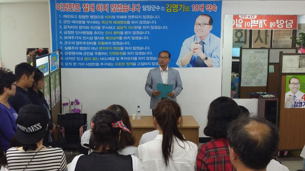 김영기 후보는 27일 선거사무실에서 지지자들이 참석한 가운데 “새로운 담양을 만들기 위해 수많은 난관과 역경을 이겨내고 이 자리까지 왔지만 변화의 시대를 열어갈 단일화 열망을 결코 외면 할 수 없었다”고 사퇴배경을 설명했다.(사진)