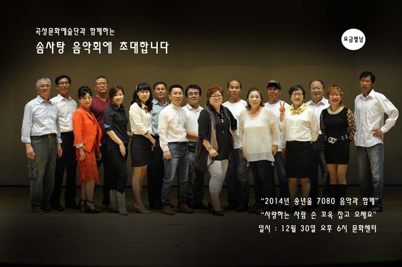 ‘아듀2014’ 솜사탕 음악회 이벤트 참여를 원하면, 28일까지 곡성문화예술단 사무국장(010-2273-8010)이나, 재무이사(010-4003-0083)에게 신청하면 된다.