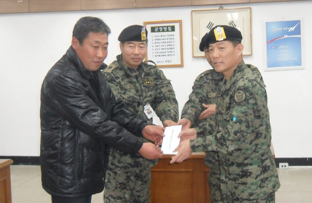 무정면에 위치한 11공수특전여단 65대대원들이 최근 무정면사무소를 방문해 어려운 이웃을 위해 사용해 달라고 성금 50만원을 기탁했다.