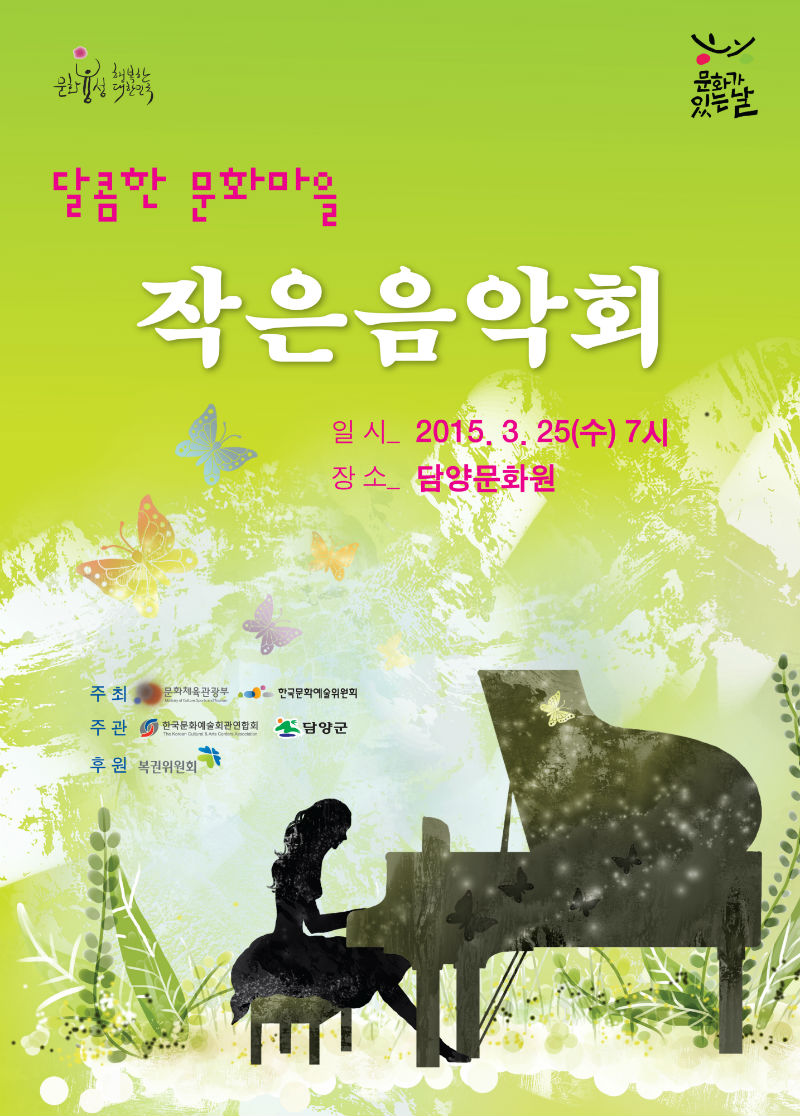 군은 3월 문화가 있는 날인 오는 25일 저녁 7시 담양문화원에서 ‘달콤한 문화마을-작은음악회’ 공연을 개최한다고 밝혔다.