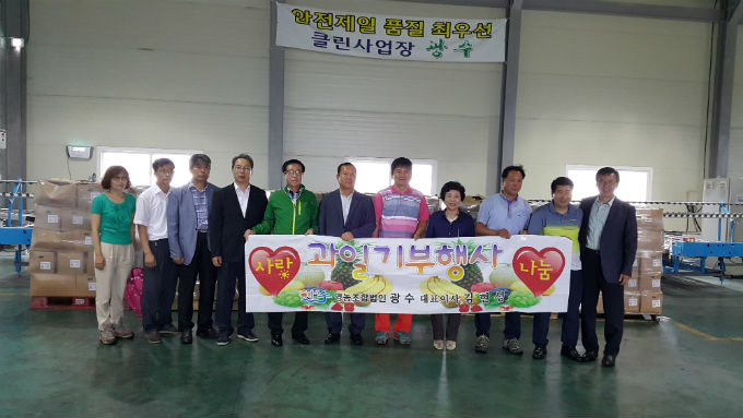 담양군의 대표적 사회적기업으로 선행과 봉사에 앞장서온 영농조합법인 광수(대표이사 김현성)가 13일 초복을 맞아 담양 관내 독거노인과 소년소녀가장 세대에 전달해달라며 수박, 멜론, 참외 등 과일꾸러미 630박스(1500만원 상당)를 기탁했다.