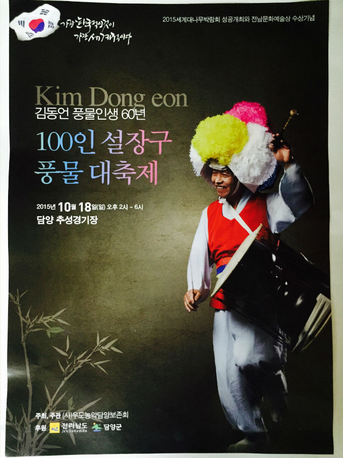 군은 2015담양세계대나무박람회 성공개최와 전남문화예술상 수상을 기념하기 위해 열리는 ‘김동언 풍물인생 60년 100인 설장구 풍물대축제’가 오는 18일 오후 2시부터 6시까지 추성경기장에서 펼쳐진다고 밝혔다.