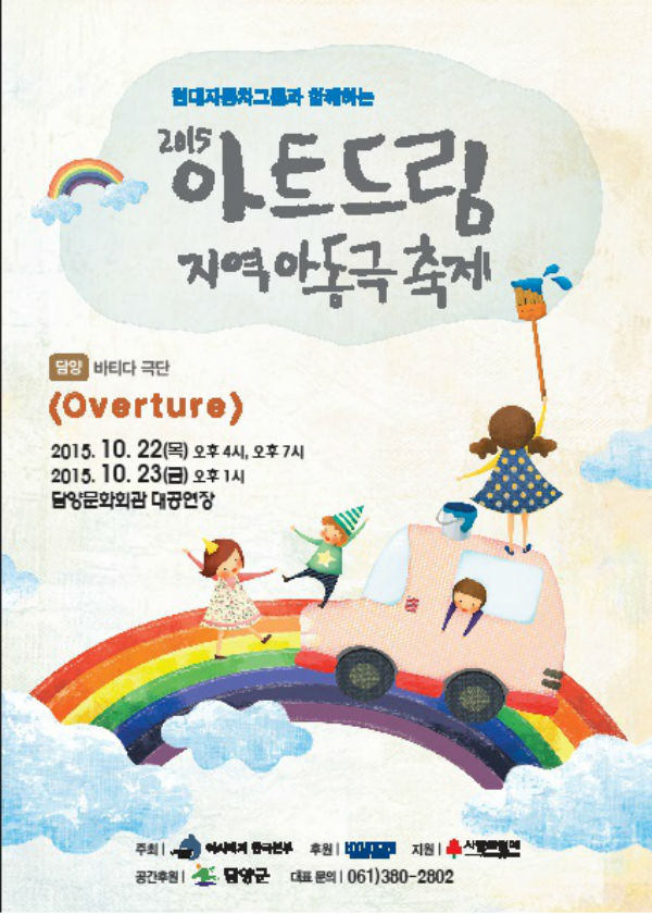 담양군은 현대자동차그룹(회장 정몽구)과 국제아동청소년연극협회 한국본부(이사장 김숙희)에서 전국 각지를 돌며 우수 아동극을 무료로 공연하는 '2015 아트드림 지역 아동극 축제'가 오는 22일과 23일 이틀간 개최된다고 밝혔다.