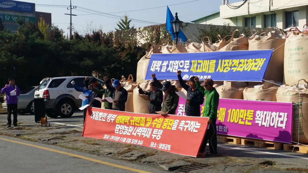 이날 농민회원들이 쌀값 안정을 촉구하기 위해 “쌀값 폭락의 주범 저가 수입쌀을 시장에서 격리하고 밥쌀용 쌀 수입을 중단하라!” , “공공비축미 매입량을 100만톤으로 확대하라!”, “40만톤의 대북 쌀 보내기를 즉각 재개하고 재고미 해결방안을 마련하라!”, “11월 14일 전국농민 총궐기투쟁에 담양군이 앞장서서 참여하고 잘못된 개방농정으로 고통 받는 농민들에게 희망을 제시하라”고 목이 터지게 외친 것이 공염불이 되지 않기를 기대한다./정종대 記者