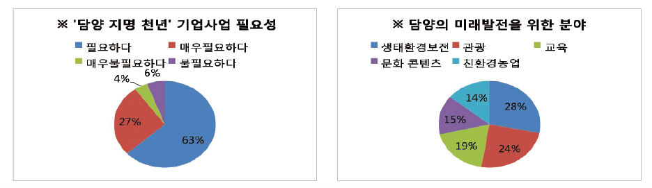 담양의 미래발전을 위해 주력을 해야 할 분야로 생태환경보전이 수위를 차지한데 이어 관광, 교육복지 문화콘텐츠, 친환경순으로 나타났다.