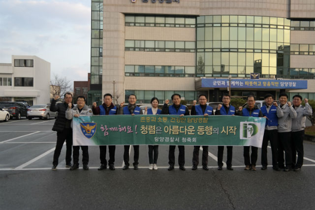 담양경찰서 청렴동아리(청죽회)는 최근 아침 경찰서 정문에서 직원 20여명이 참석한 가운데 출근하는 직원들을 상대로 건전한 연말연시 보내기 홍보와 함께 ‘함께 해요, 청렴은 아름다운 동행의 시작’이란 캐치플레이로 청렴 캠페인을 실시했다.