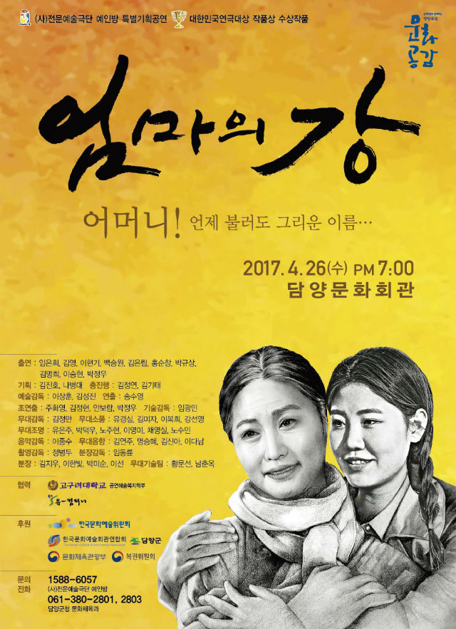 담양군은 4월 문화가 있는 날을 맞아 대한민국 연극 대상 작품상 수상작, 연극 '엄마의 강'이 오는 26일 오후 7시 담양문화회관 대공연장 무대에 오른다고 전했다.