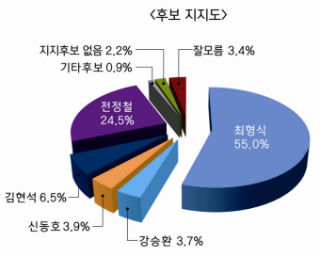 조사결과 민주당 최형식 후보가 55.0%의 지지율로 1위를 기록하며 2위 무소속 전정철 후보(24.5%)를 30.5% 차이로 앞선 것으로 나타났다.