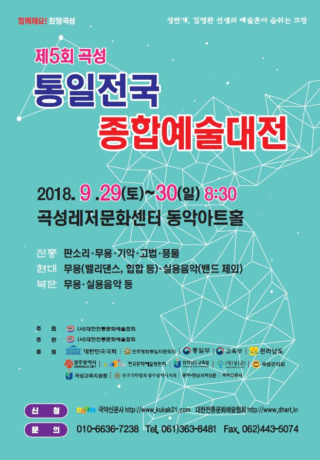 (사)대한전통문화예술협회(대표 최한용)가 주최하고 곡성군이 주관하는 이번 행사는 전국단위 경연대회로 9월 29일 첫째날 학생부 판소리 예선경연을 시작으로 무용, 기악, 고법, 풍물, 현대, 북한예술 부문에서 열띤 경연이 펼쳐질 계획이다.