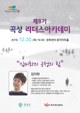 곡성군이 오는 20일(목) 오후 4시 곡성문화센터 동악아트홀에서 방송인 김미화 씨를 초청하여‘긍정의 힘’이라는 주제로 강연을 진행한다.