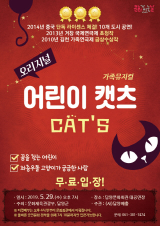 오는 29일 오후 7시 5월 문화가 있는 날을 맞아 담양문화회관에서 가족뮤지컬 ‘어린이 캣츠’ 공연이 열린다.