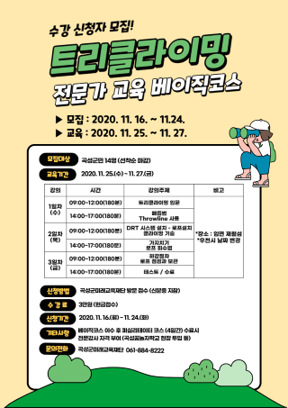곡성군미래교육재단이 11월 24일까지 트리클라이밍 전문가 교육과정 참가자를 모집한다.