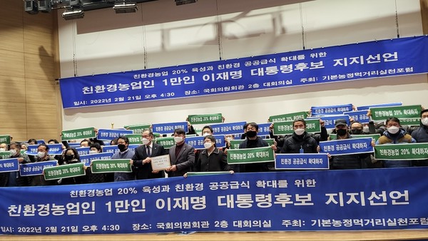 특히 21일에는 도시농업네트워크, 농해수공공기관 노동조합, 친환경무상급식연대, 친환경농업협회, 접경지군급식생산자회 등 하루에만 5개 단체가 이재명 후보에 대한 지지를 선언하거나 정책협약식을 맺었다.