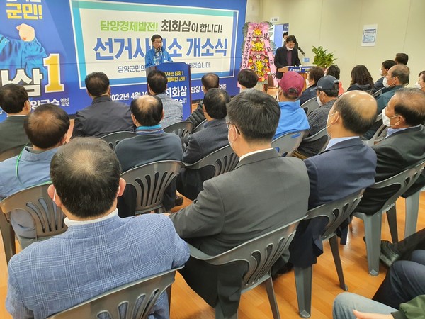 최화삼 예비후보는 10일 오후 2시 담양읍 백동리 구.신협 2층에 마련된 선거사무소에서 이개호 국회의원을 비롯한 내빈과 수백명의 지지자들이 참석한 가운데 개소식을 갖고 ‘금품과 네거티브 없는 깨끗한 선거’를 통해 반드시 승리하겠다고 다짐했다.