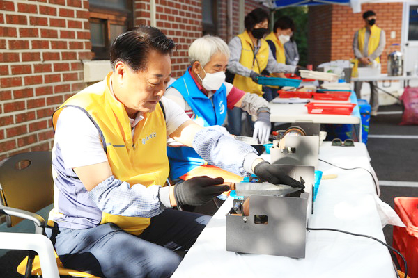 지역의 여러기관과 주민들 모두가 연대해서 실시중인 찾아가는 희망복지 기동서비스 현장을 찾아 서툰 솜씨지만 직접 칼을 가는 봉사활동을 펼쳐 주민들과 즐거움을 공유하는 등 개인이 가진 능력이나 힘은 작지만 모이면 큰 힘을 발휘 할 수 있다는 공존과 상생의 힘을 보여주었다. (사진)