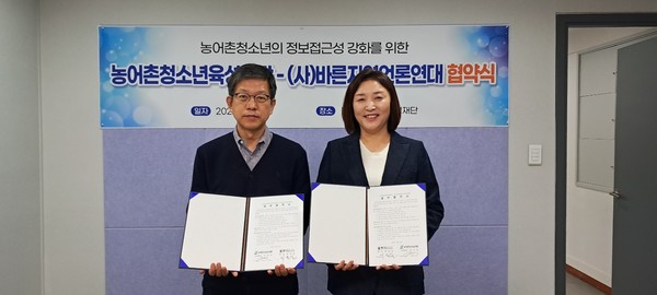 농어촌청소년육성재단(박성자 이사장, 이하 재단)과 바른지역언론연대(최종길 회장, 이하 바지연)가 지난 12일 농어촌 청소년의 인재양성과 복지증진을 위한 업무협약을 체결했다.