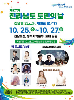 전라남도는 22개 시군이 함께하는 소통과 화합의 장인 제27회 전라남도 도민의 날 기념행사를 10월 25일부터 27일까지 도청 및 동부청사 일원에서 펼친다고 밝혔다.