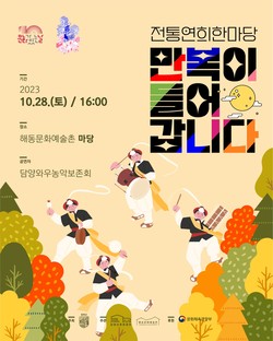 (재)담양군문화재단은 오는 28일 토요일 오후 4시 해동문화예술촌 마당에서‘전통연희한마당 : 만복이 들어갑니다’를 개최한다고 밝혔다.